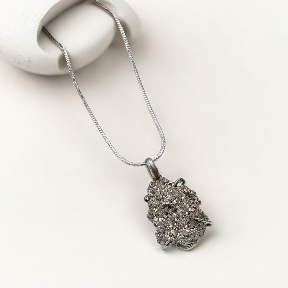 The geode Pyrite crystal pendant is the natural pyrite crystal geode placed in a locket mold.